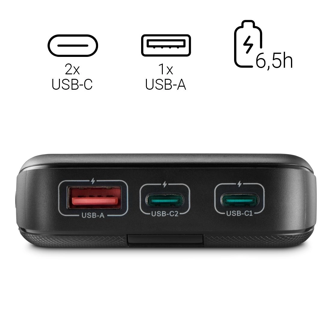 Nasz powerbank umożliwia ładowanie aż trzech urządzeń jednocześnie dzięki dwóm portom USB-C oraz jednemu portowi USB-A. Oznacza to, że możesz ładować telefon, tablet i smartwatch w tym samym czasie, co jest bardzo praktyczne podczas podróży lub intensywnego dnia.
