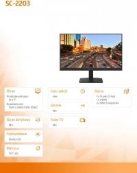 Monitor 22'' SC-2203 został zaprojektowany z myślą o efektywnym wyświetlaniu treści i estetycznym wyglądzie. Wyposażony w technologię LED VA zapewnia żywe kolory i ostre detale, dzięki czemu doskonale sprawdzi się zarówno w środowisku pracy, jak i podczas oglądania multimediów. Dzięki możliwości podłączenia przez złącza HDMI, VGA i BNC monitor jest bardzo wszechstronny.