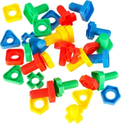 Poszczególne śruby i nakrętki mają różne kształty, które należy prawidłowo sparować. Dzięki prostemu zasadniczemu mechanizmowi układanka jest odpowiednia dla przedszkolaków i świetnie wspiera wyobraźnię przestrzenną oraz cierpliwość.