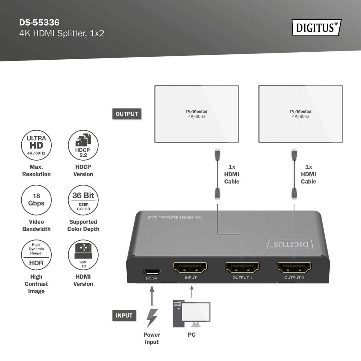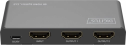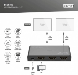 Rozdzielacz HDMI DIGITUS rozdziela lub duplikuje sygnały audio i wideo z urządzenia HDMI na dwa wyjścia, co pozwala na jednoczesne wyświetlanie na wielu ekranach. Dzięki funkcji downscalingu obsługuje wyświetlanie 4K na ekranach Full HD, co umożliwia równoczesne użycie wyświetlaczy 4K i Full HD.