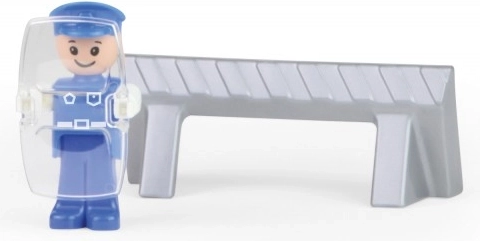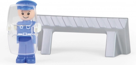 W zestawie znajduje się aktywna figurka policjanta z tarczą oraz bariera drogowa, które pozwalają dzieciom tworzyć własne policyjne scenariusze i ćwiczyć rolę pomagania i ochrony. Zabawka jest w pełni mechaniczna – bez baterii, sama przyjemność zabawy.