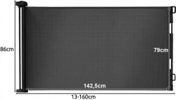 Praktyczna, wysuwana bramka zabezpieczająca z siatką chroni dzieci i zwierzęta domowe przed niebezpiecznymi strefami w domu. Łatwa w obsłudze, oszczędza miejsce, a dzięki czarnej kolorystyce pasuje do każdego wnętrza. Rozsuwana do 160 cm, wysokość 86 cm, wytrzymała siatka PVC oraz solidne metalowe i plastikowe elementy zapewniają niezawodną barierę przy drzwiach, w korytarzach i przy schodach.