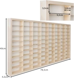 Dzięki wyjmowanym przegrodom z 3 mm sklejki układ dopasujesz dokładnie do wielkości kolekcji. Półkę możesz powiesić na ścianie (w zestawie są zawieszki i zestaw montażowy) lub postawić na komodzie czy stole. Naturalny sosnowy dekor dodatkowo pięknie dopełni wystrój pokoju dziecięcego.