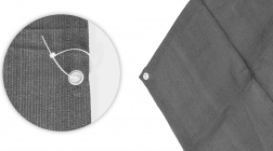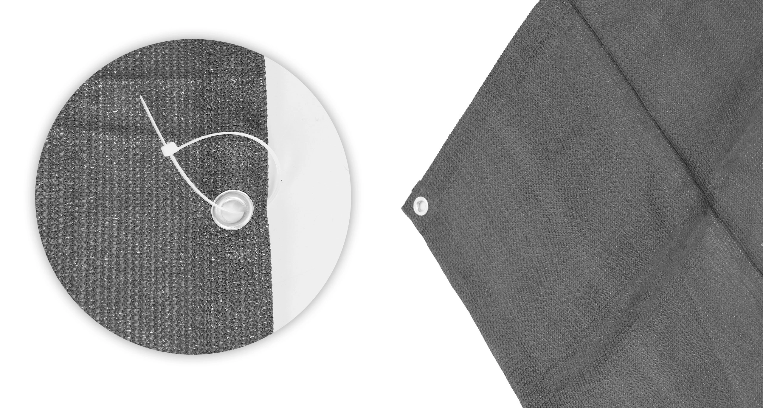 W skład zestawu wchodzą aluminiowe oczka umieszczone co około 40 cm wzdłuż krawędzi, zapewniające stabilne i trwałe mocowanie do balustrady. Dzięki odporności na korozję, pozostają funkcjonalne i estetyczne nawet po długotrwałym użytkowaniu na zewnątrz. Zestaw montażowy zawiera 26 opasek zaciskowych i 2 sznury po 8 metrów do szybkiej instalacji po obu stronach balustrady. Elastyczna konstrukcja umożliwia łatwą adaptację do różnych balkonów i tarasów.