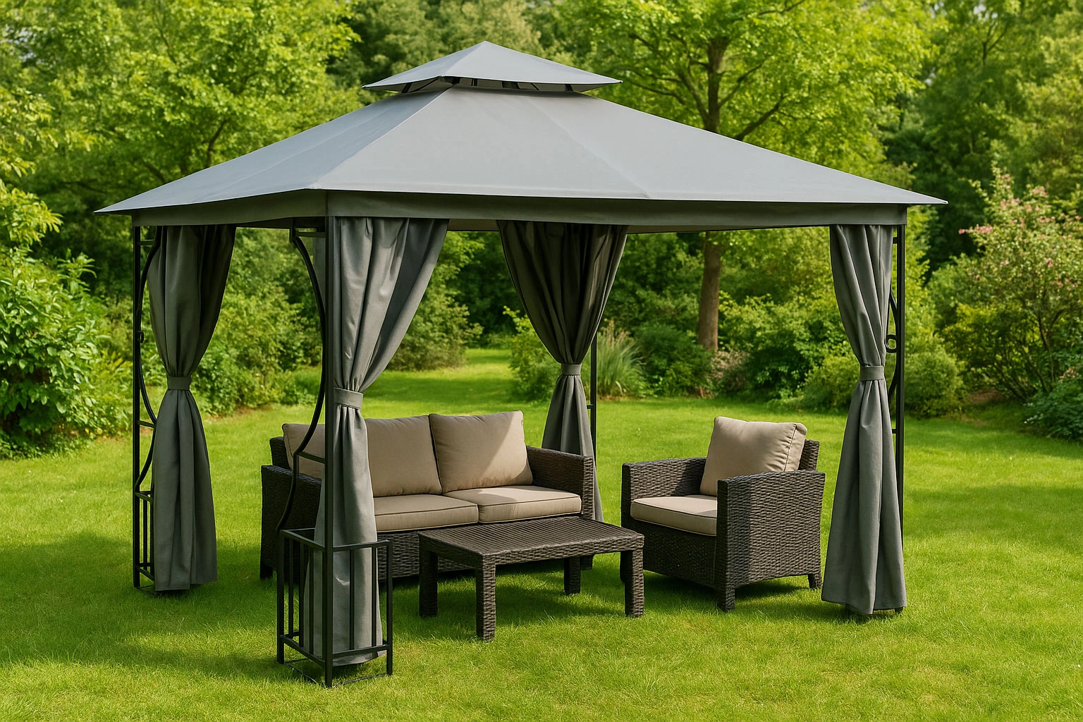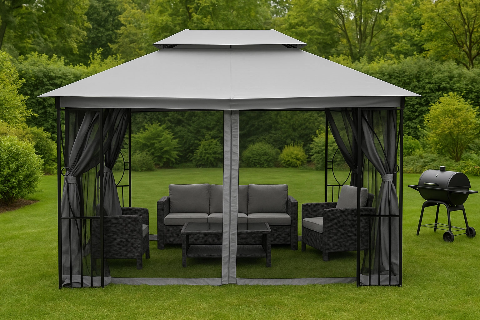 Podwójny dach: Specjalny otwór wentylacyjny na szczycie dachu znacząco poprawia przepływ powietrza wewnątrz altany, pomaga ograniczać nagrzewanie w upalne dni i zapobiega gromadzeniu się wilgoci. Otwór pomaga też redukować napór wiatru przy silnych podmuchach.