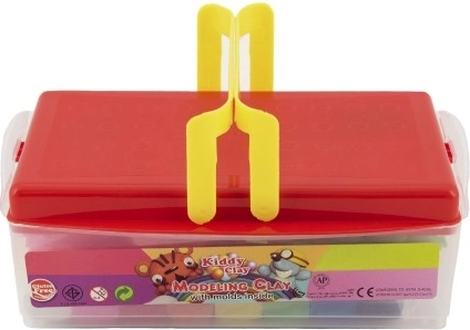 Zestaw kolorowych mas plastycznych z wykrawaczkami i wałkiem w plastikowym pudełku
