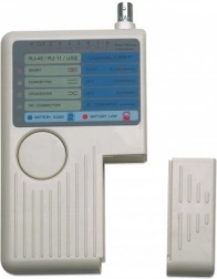 Ten tester kabli 4 w 1 skutecznie testuje kable typu RJ11, RJ45, USB i BNC za pomocą jednego naciśnięcia przycisku. Wyposażony jest w diody LED sygnalizujące połączenia oraz ewentualne błędy.