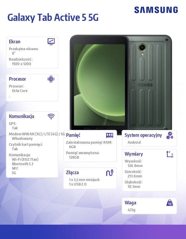 Tablet Samsung Galaxy Tab Active5 5G został zaprojektowany, aby sprostać nawet wymagającym warunkom. Oferuje wyjątkową odporność i łatwość przenoszenia dzięki kompaktowemu rozmiarowi 8,0 cala. Z łącznością 5G masz pewność szybkiego i stabilnego połączenia, niezależnie od miejsca pracy.