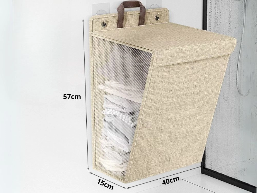 Praktyczny wiszący kosz na pranie w eleganckim beżowym kolorze oszczędza miejsce i utrzymuje porządek w łazience, garderobie i pralni. Dzięki montażowi bez wiercenia łatwo zawiesisz go na ścianie lub drzwiach, ma solidną konstrukcję, wygodne uchwyty oraz oddychającą siateczkę dla lepszej cyrkulacji powietrza. Składana konstrukcja umożliwia szybkie złożenie na płasko.