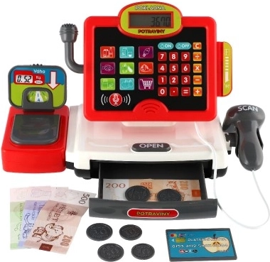 - Działający kalkulator, slot na kartę kredytową, waga do owoców i warzyw