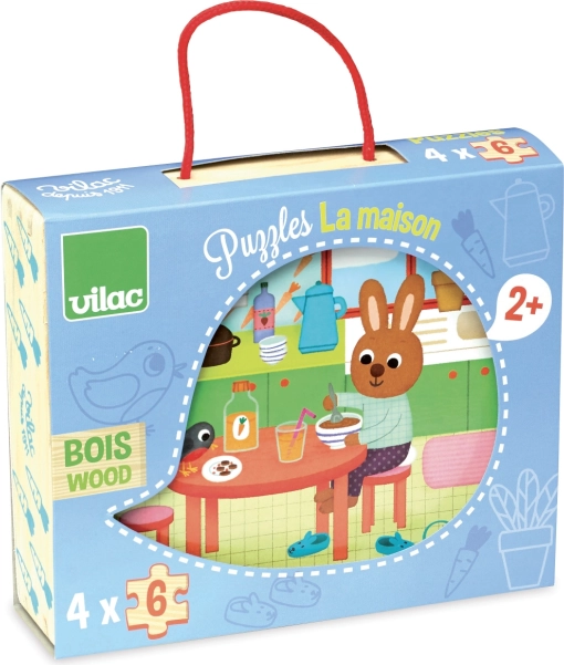 Te urocze drewniane puzzle VILAC o tematyce domowej dają dzieciom radość z odkrywania i układania. Cztery różne obrazki zapewniają urozmaiconą zabawę, a kompaktowe drewniane pudełko z rączką ułatwia przenoszenie i przechowywanie.