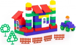 Zawiera różne kształty, takie jak domy, drzewa i płoty, które dzieci mogą układać zgodnie ze swoją wyobraźnią.