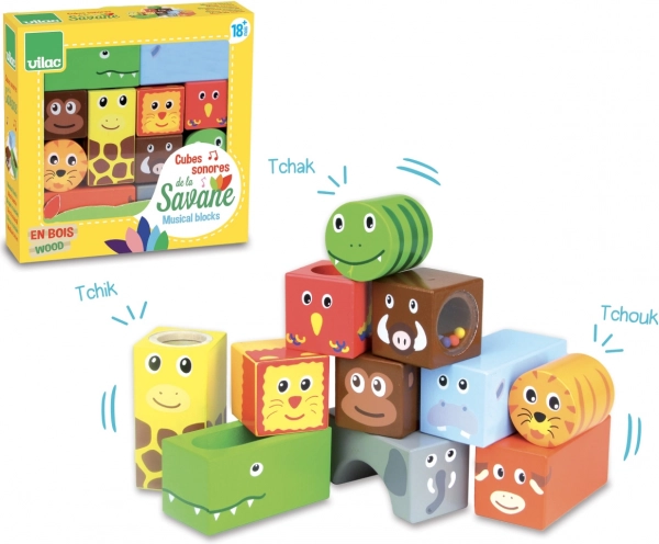 Odkryj świat dźwięków i wyobraźni z drewnianymi klockami VILAC Sawanna. Zestaw zawiera 11 sensorycznych klocków, które pomagają dzieciom rozwijać motorykę małą, percepcję słuchową oraz koordynację ręka-oko. Atrakcyjny motyw sawanny i różnorodne efekty dźwiękowe zapewnią wiele godzin zabawy.