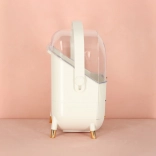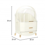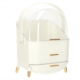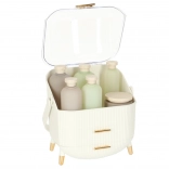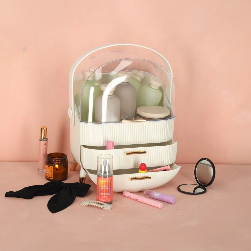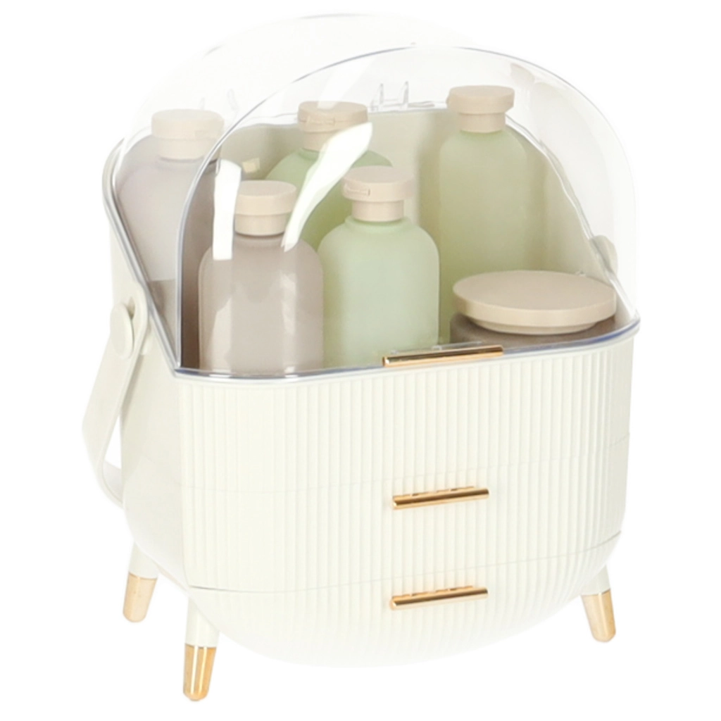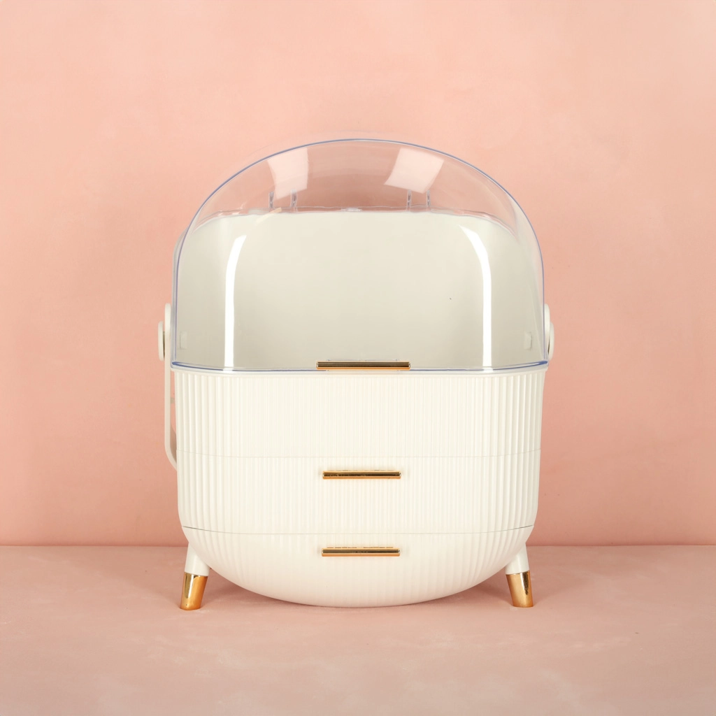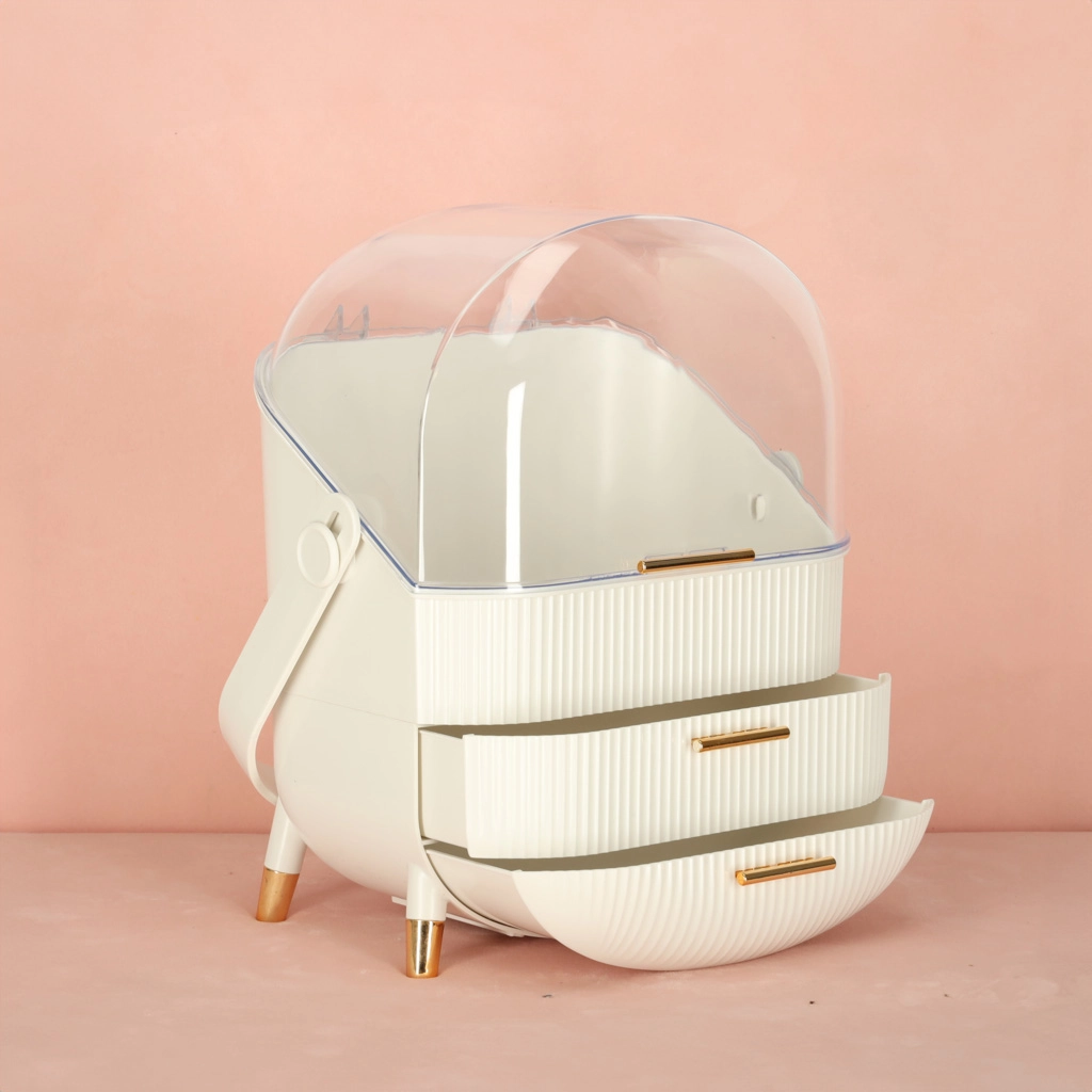 Przezroczysta pokrywa eksponuje Twoje kosmetyki w eleganckim stylu, jednocześnie chroniąc je przed kurzem. Subtelne złote detale dodają luksusu.