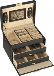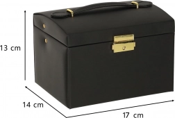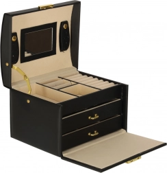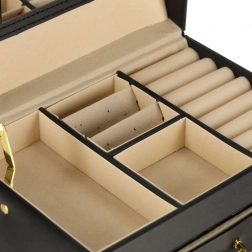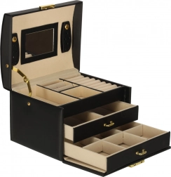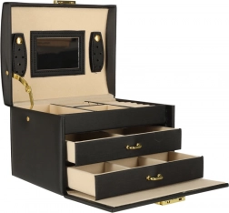 Pomysłowy układ obejmuje wałki na pierścionki, przegródki na drobiazgi oraz 2 wysuwane szufladki z podziałem na łańcuszki, bransoletki i kolczyki. Zamykanie na kluczyk i niezawodny zatrzask zapewniają bezpieczne przechowywanie cennych przedmiotów.