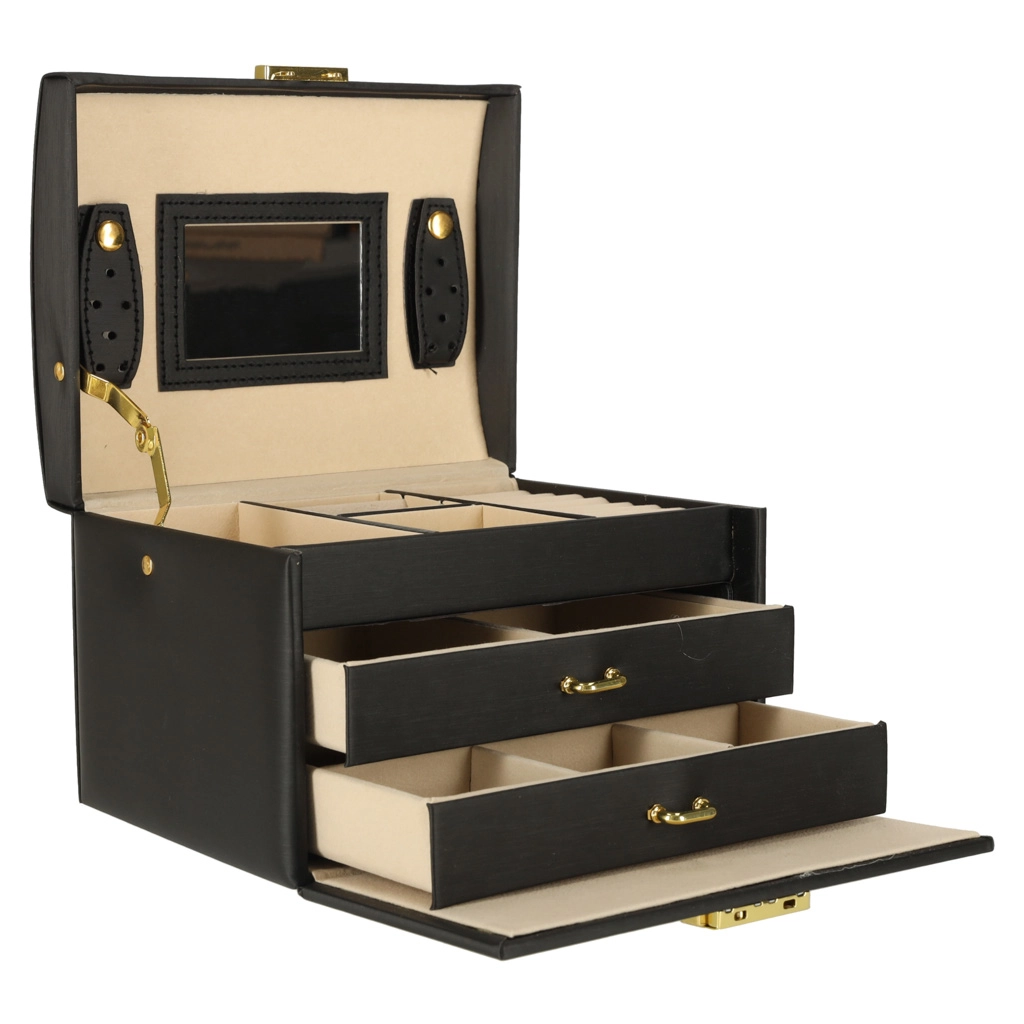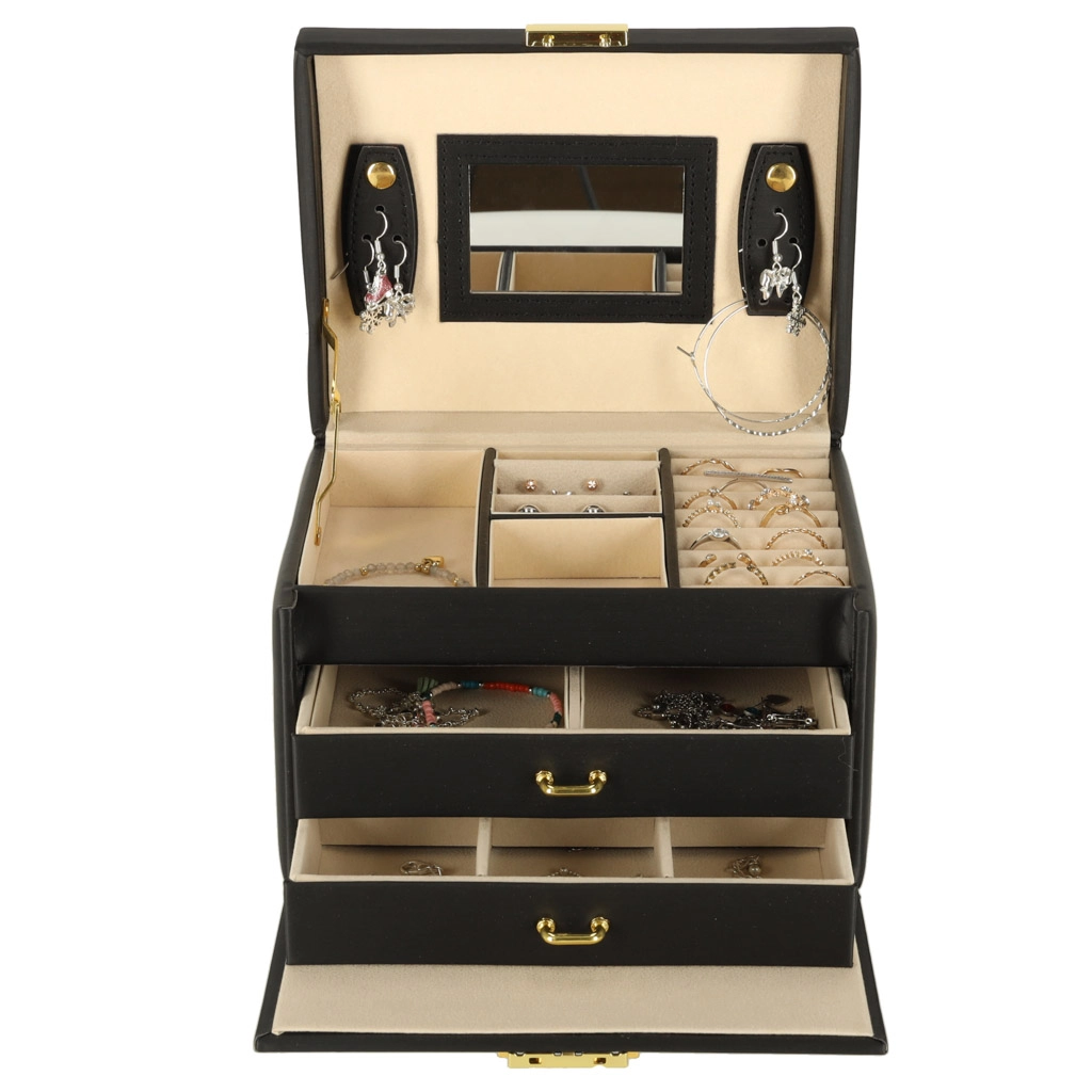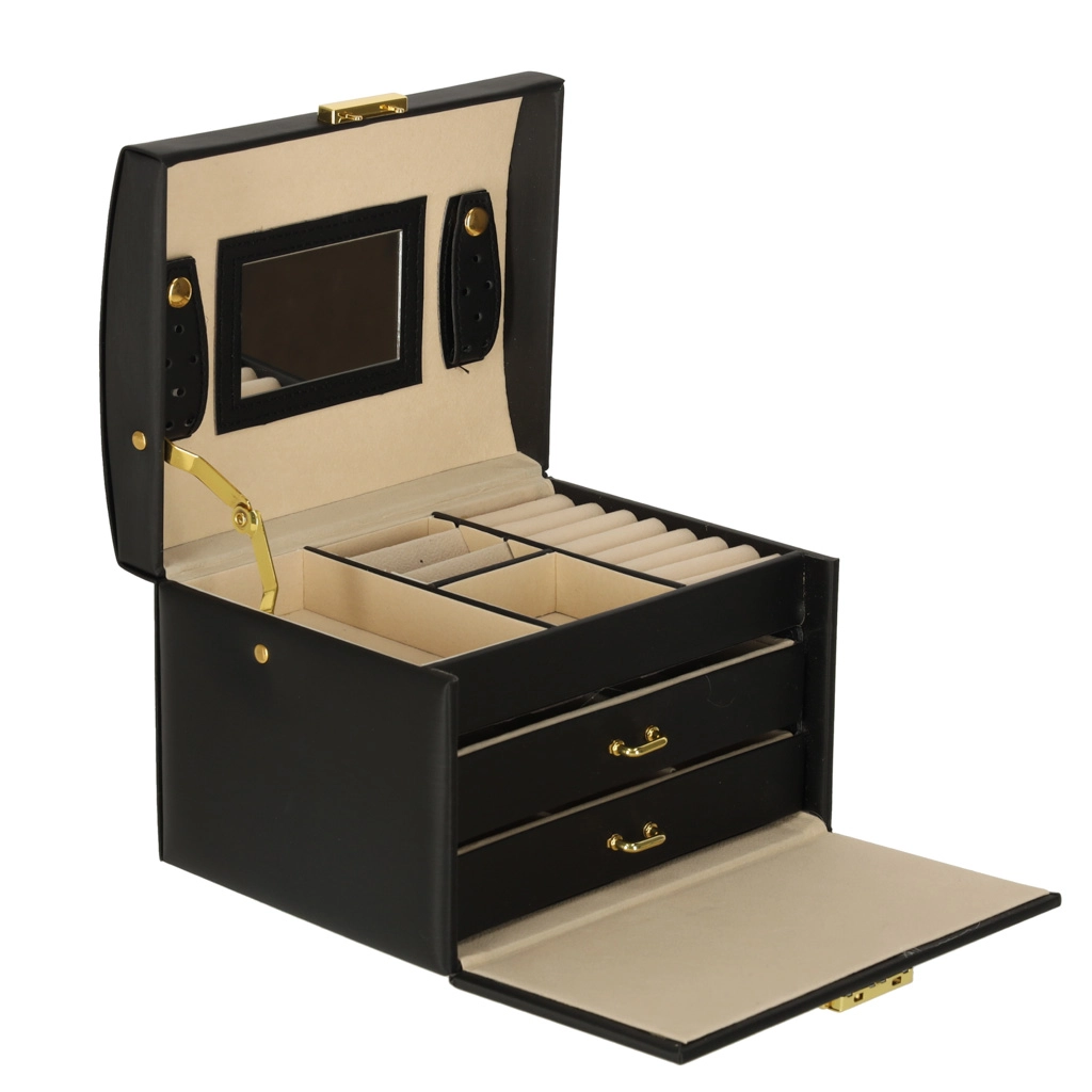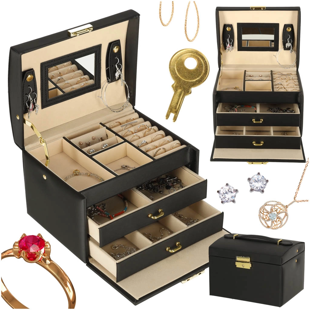 Elegancka czarna szkatułka na biżuterię z lusterkiem i szufladkami do przejrzystego przechowywania pierścionków, kolczyków, bransoletek i naszyjników. Oferuje pojemne przegródki, dwie szuflady, miękką wyściółkę chroniącą przed zarysowaniami oraz zamek na kluczyk dla większego bezpieczeństwa. Idealne rozwiązanie do zorganizowanego przechowywania biżuterii w domu i w podróży.