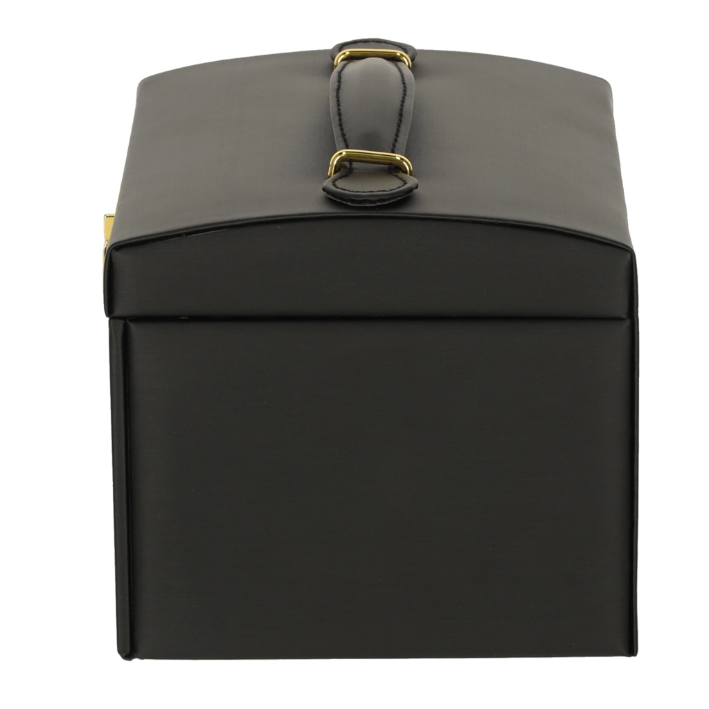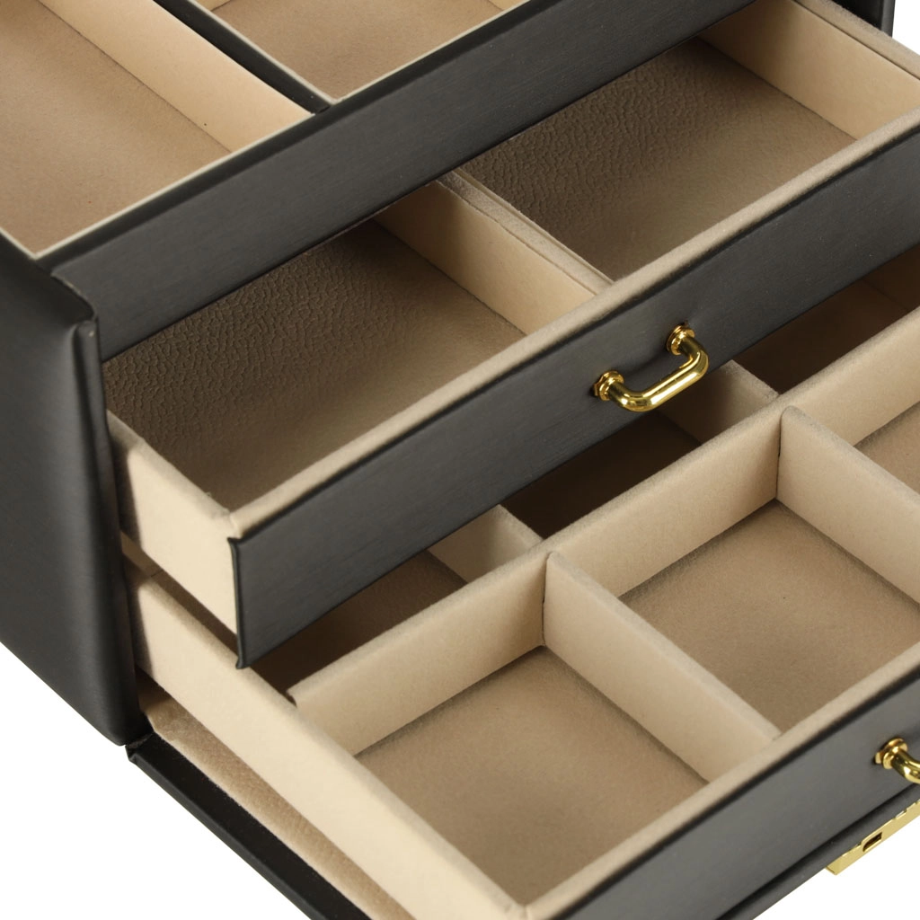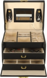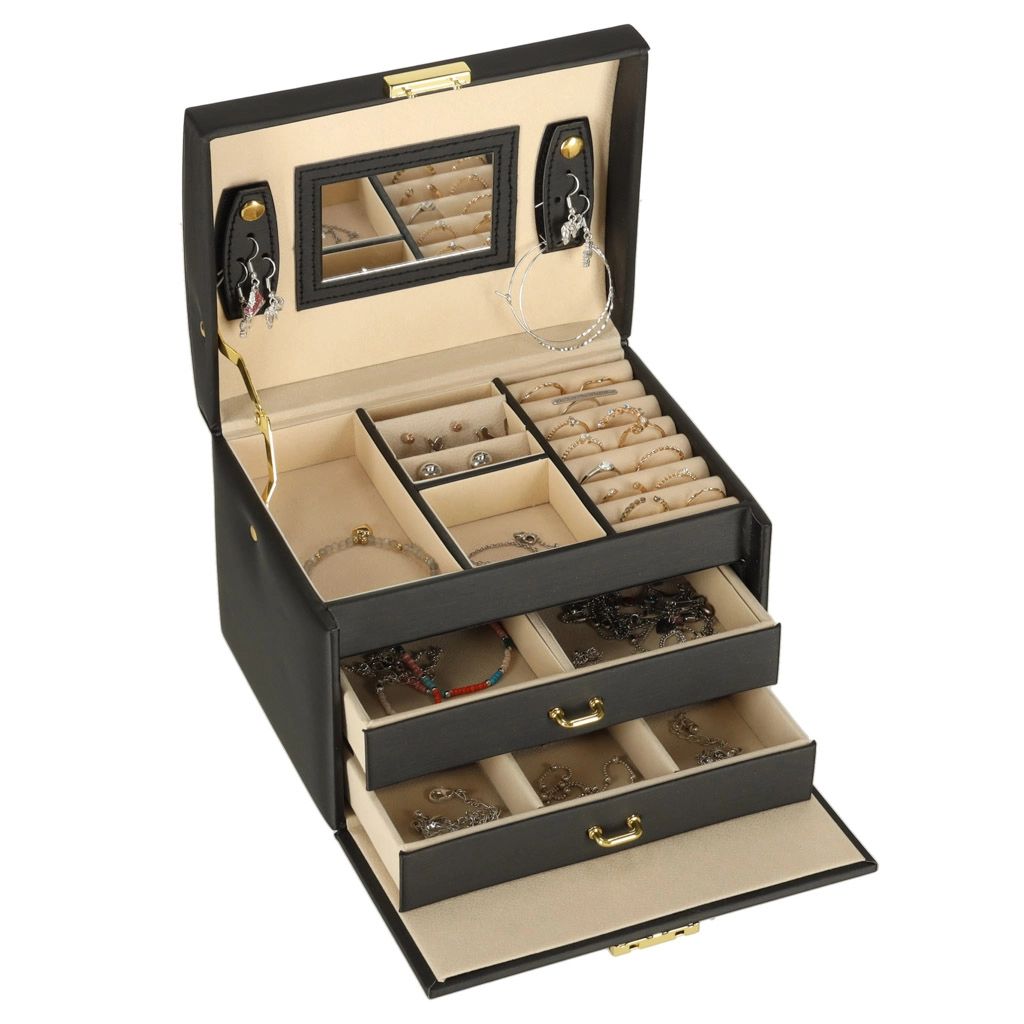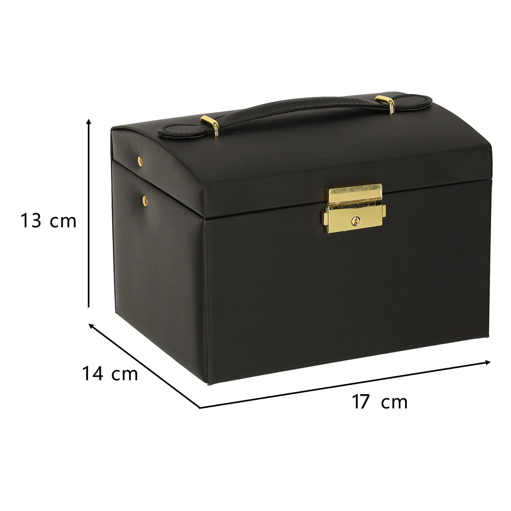 Elegancka czarna szkatułka na biżuterię z lusterkiem i szufladkami do przejrzystego przechowywania pierścionków, kolczyków, bransoletek i naszyjników. Oferuje pojemne przegródki, dwie szuflady, miękką wyściółkę chroniącą przed zarysowaniami oraz zamek na kluczyk dla większego bezpieczeństwa. Idealne rozwiązanie do zorganizowanego przechowywania biżuterii w domu i w podróży.