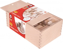 Klocki wykonano z wytrzymałego drewna o gładkiej powierzchni dla bezpiecznej zabawy. Praktyczne drewniane pudełko z wsuwanym wieczkiem ułatwia przechowywanie i utrzymanie porządku w pokoju dziecięcym.
