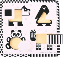 Odkryj pierwszą układankę dla najmłodszych: czarno-białą układankę wpuszczaną z litego drewna z motywami zwierzątek. Kontrastowe kolory wspierają percepcję wzrokową, a duże elementy łatwo trzymać małymi rączkami. Rozwija małą motorykę, zmysły i koncentrację. Wykonana z wysokiej jakości, odpowiedzialnie pozyskiwanego drewna, spełnia europejskie normy bezpieczeństwa.