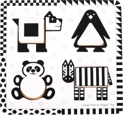 Czarno-białe motywy zwierzątek stymulują wzrok i pomagają dzieciom lepiej rozróżniać kształty oraz kontury.