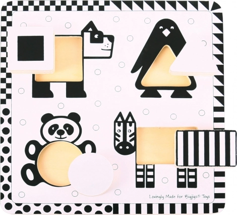 Czarno-biała układanka wpuszczana BIGJIGS TOYS została zaprojektowana specjalnie dla najmłodszych dzieci. Kontrastowa kolorystyka pomaga niemowlętom lepiej wyostrzać wzrok i postrzegać kształty, a cztery duże drewniane elementy z motywami zwierząt wygodnie wsuwa się w odpowiednie otwory.