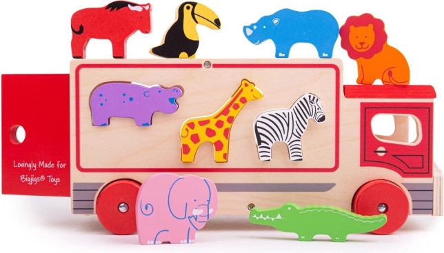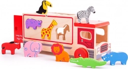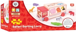 Ta kolorowa drewniana zabawka zawiera rozpoznawalne zwierzęta, które można załadować na ciężarówkę za pomocą specjalnych otworów w dachu i bokach pojazdu. Dzieci mogą segregować kształty i uczyć się o różnych zwierzętach, a następnie umieszczać każde zwierzę w odpowiednim otworze. Gdy wszystkie zwierzęta znajdą się na swoim miejscu, tylne drzwi ciężarówki zamkną się i będą gotowe na kolejną przygodową podróż.