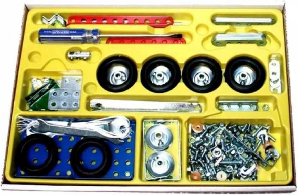 Metalowa konstrukcyjna zabawka Merkur to klasyka czeskich warsztatów. W tym zestawie znajdziesz wszystko, co potrzebne do złożenia ciężarówki i kolejnych dziewięciu modeli. Elementy z wytrzymałego metalu, śrubki i nakrętki pewnie trzymają konstrukcję razem, dzięki czemu dzieci i dorośli mogą cieszyć się stabilnymi, funkcjonalnymi modelami i wielokrotnym budowaniem.