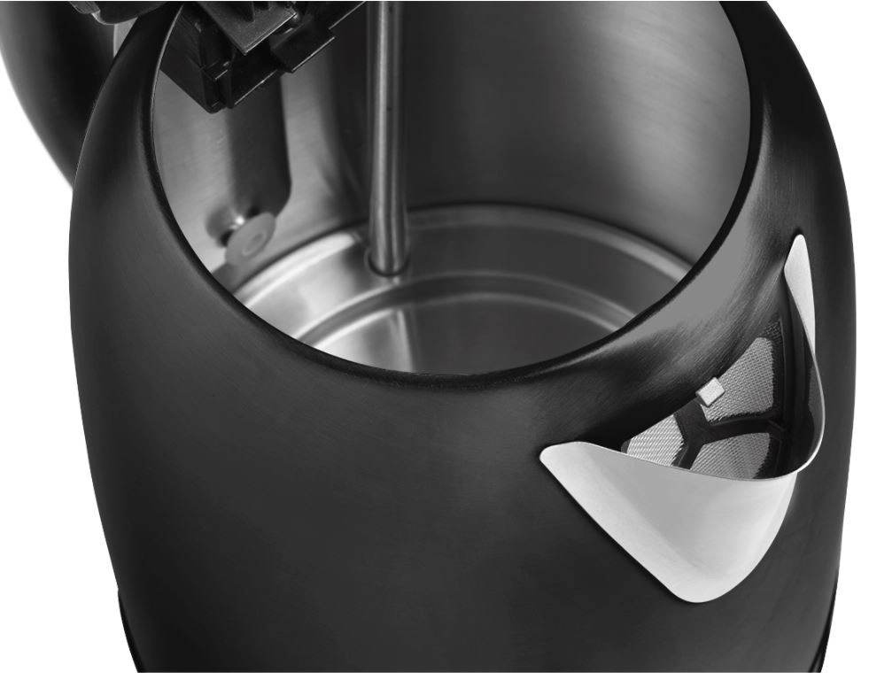Czajnik zaprojektowano z myślą o maksymalnej wygodzie. Specjalna wylewka ułatwia nalewanie wody, a przycisk w pokrywie pozwala szybko ją otworzyć. Szeroki korpus łatwo się czyści, a wyjmowany filtr zapobiega osadzaniu się kamienia.
