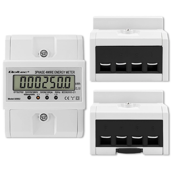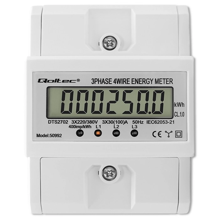 Ten elektroniczny licznik pozwala na precyzyjne monitorowanie wykorzystania energii w trójfazowych systemach elektrycznych o napięciu 230V/400V i częstotliwości 50Hz. Wskaźnik LED sygnalizuje przebieg zużycia, natomiast wyświetlacz LCD prezentuje dane o zużytej energii. Pomiar odbywa się na podstawie liczby impulsów z częstotliwością 400 impulsów/kWh.