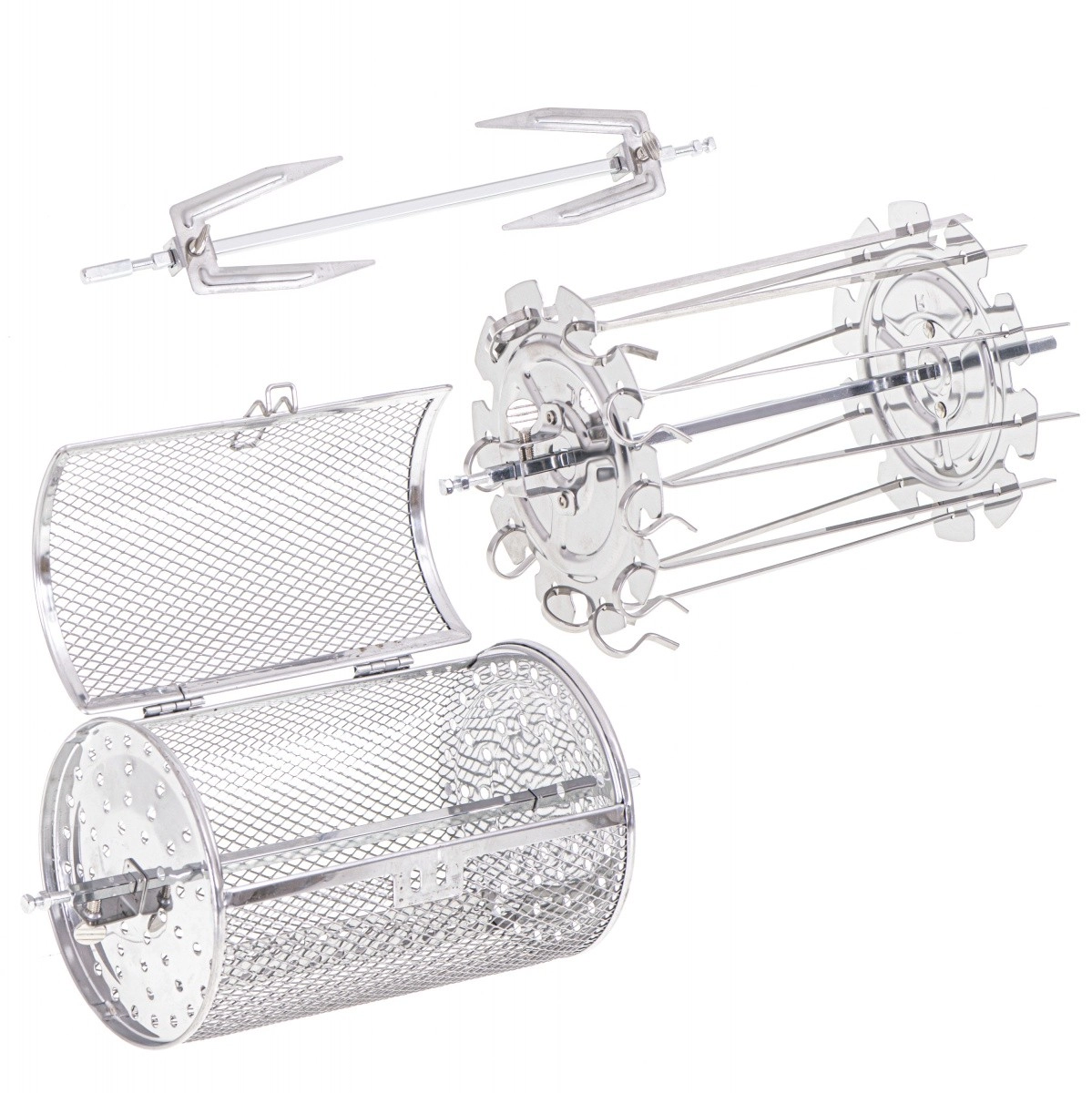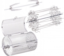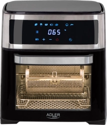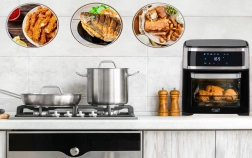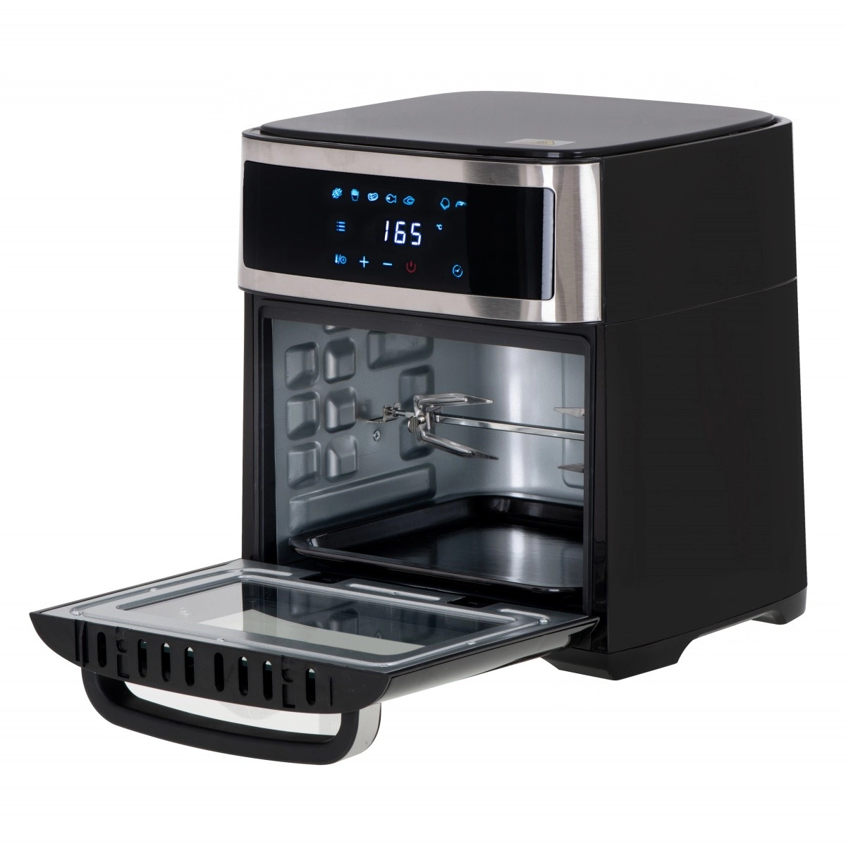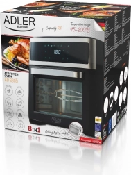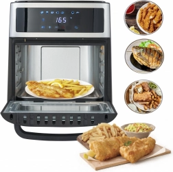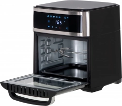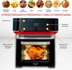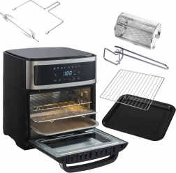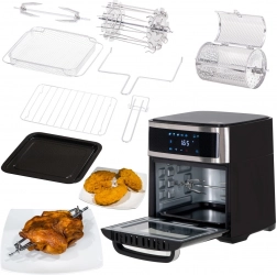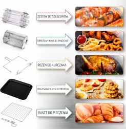 Urządzenie oferuje osiem różnych programów do rozmaitych potraw, takich jak skrzydełka kurczaka, ryby, krewetki, steki i inne. W zestawie znajdują się również przydatne akcesoria, takie jak rożen do kurczaka, blacha do pieczenia czy kosz do frytkownicy. Wszystkie elementy wykonano z trwałych materiałów i można je myć w zmywarce.
