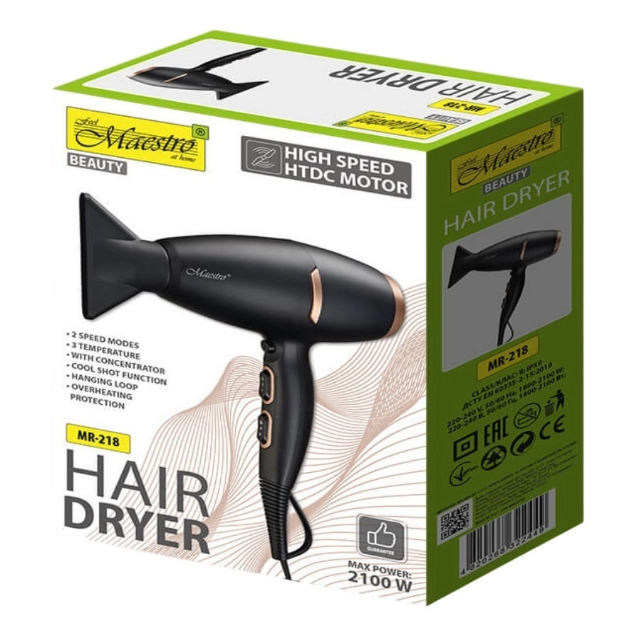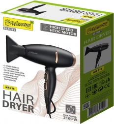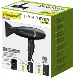 Suszarka Maestro jest wyposażona w dwie dysze koncentrujące do precyzyjnego stylizacji i kierowania strumienia powietrza tam, gdzie jest najbardziej potrzebny. Oferuje dwa poziomy prędkości nadmuchu oraz trzy ustawienia temperatury, co pozwala dostosować działanie do indywidualnych potrzeb i typu włosów.