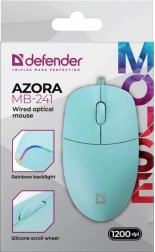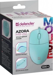 Opakowanie z myszą Defender Azora w niebieskim kolorze podkreśla efektywność z DPI 1200 i znakomitym silikonowym kółkiem przewijania.