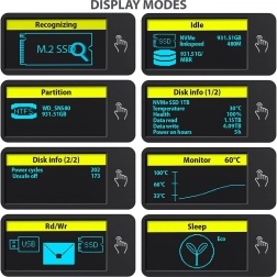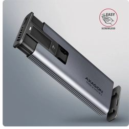 Obudowa AXAGON została wyposażona w zaawansowany wyświetlacz LED, który zapewnia natychmiastowy podgląd stanu dysku. Ekran pokazuje informacje takie jak wykrycie dysku, system plików, temperaturę, stan dysku, prędkość transferu danych oraz całkowity czas pracy. Dzięki monitorowaniu temperatury w czasie rzeczywistym i trybowi oszczędzania energii masz pełną kontrolę nad stanem dysku.