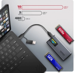 Obudowa obsługuje transfer do 10 Gb/s dzięki USB 3.2 Gen 2. Jest kompatybilna z funkcjami UASP i TRIM oraz umożliwia odczyt informacji S.M.A.R.T. Bezśrubowe otwieranie ułatwia montaż dysków M.2 SSD. Obudowa pozwala montować dyski o długościach 42, 60 i 80 mm i wspiera zarówno jednostronne, jak i dwustronne nośniki.