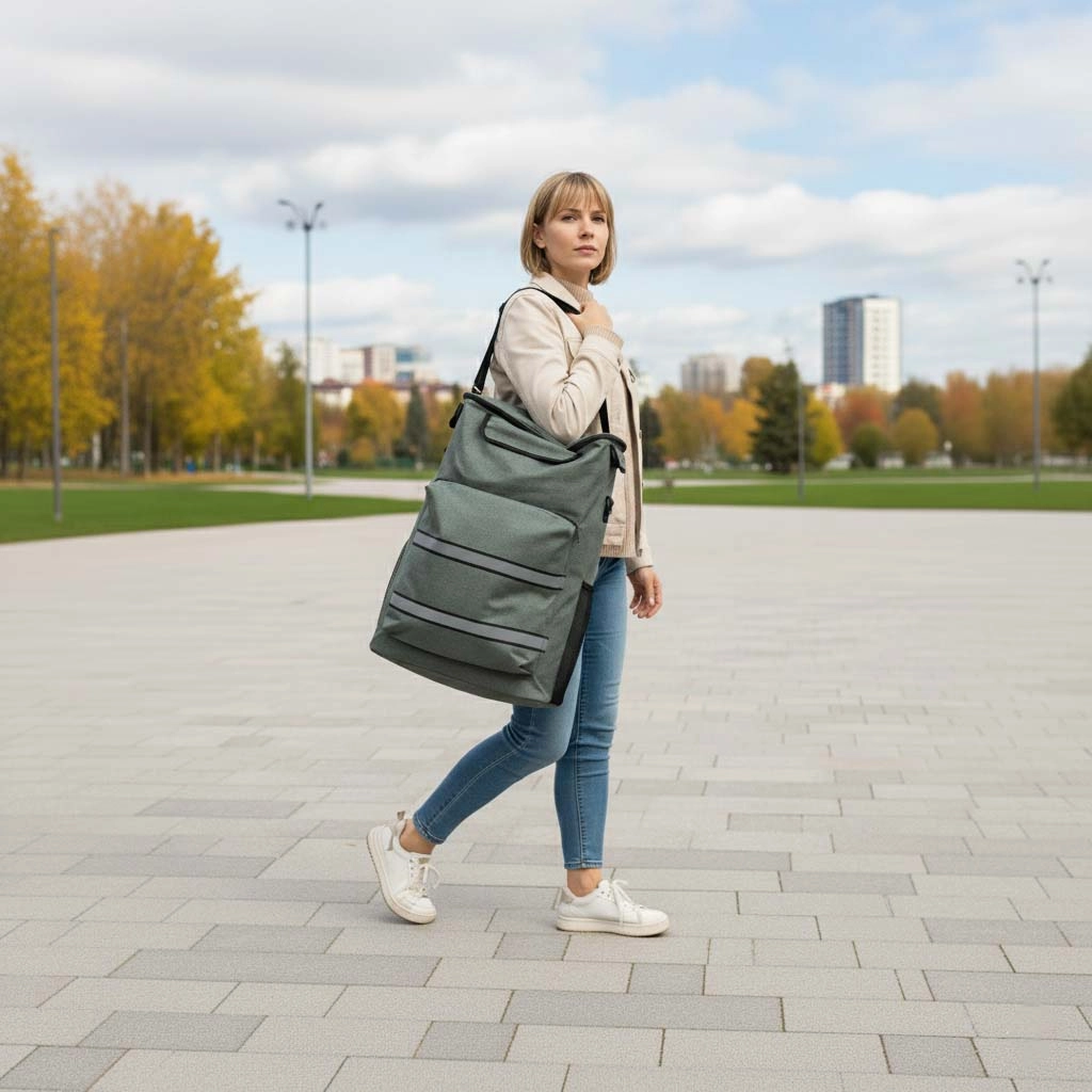 Dzięki dużym kołom i obrotowemu uchwytowi manewrowanie jest płynne nawet na nierównościach. Pasy odblaskowe zwiększają widoczność o zmierzchu, więc ciemność Cię nie zaskoczy. Torbę można łatwo zdjąć ze stelaża, co ułatwia przenoszenie i przechowywanie.