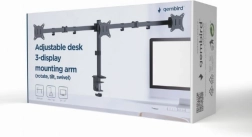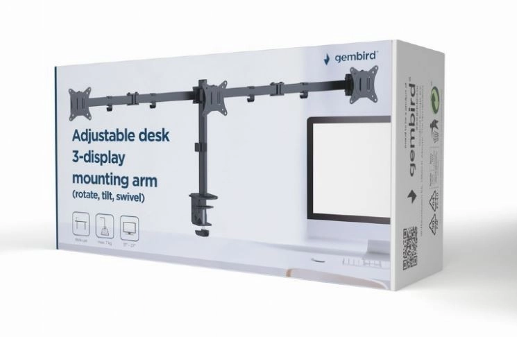 Wygodnie ustaw swoje monitory za pomocą regulowanego biurkowego uchwytu na trzy monitory, który obsługuje ekrany o przekątnej od 17 do 27 cali i masie do 7 kg.