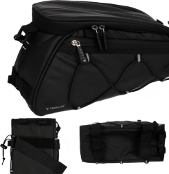 Bezpieczne mocowanie do bagażnika roweru zapewniają rzepy i karabińczyki, tworząc stabilną i spójną konstrukcję. Dodatkowe elementy odblaskowe zwiększają widoczność podczas nocnej jazdy, co gwarantuje bezpieczeństwo.