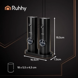 Elektryczne młynki do pieprzu i soli marki RUHHY są idealnym dodatkiem dla wszystkich ceniących jakość i estetykę. Uniwersalne użycie umożliwia wykorzystanie ich do różnych typów przypraw, w tym ziół. Mielenie zapewnia ceramiczny mechanizm, który jest trwały i precyzyjny, bez metalicznego posmaku.