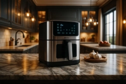 Frytkownica zapewnia szybką i równomierną cyrkulację powietrza, dzięki czemu uzyskasz efekt chrupiącej skórki bez konieczności smażenia w tłuszczu. Wnosi zdrowie i wygodę do Twojej kuchni – bez pryskającego tłuszczu i dymu.