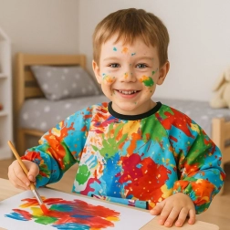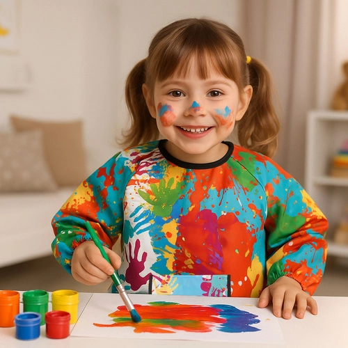 Fartuch Kruzzel jest idealny do dziecięcych projektów artystycznych i kuchennych eksperymentów. Wykonany z wodoodpornego materiału, chroni ubrania przed farbami, klejem i tuszem. Długie rękawy i wygodny krój zapewniają pełne zakrycie, idealne do aktywności w domu i w przedszkolu.