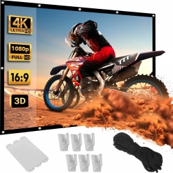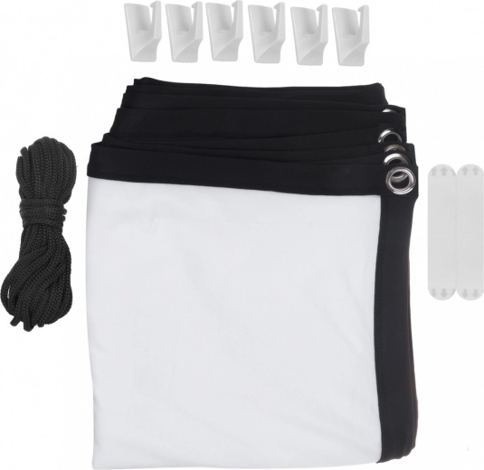 Montaż na ścianie jest łatwy dzięki dołączonym haczykom i taśmie samoprzylepnej. Ekran można łatwo usunąć i przenieść w inne miejsce. W zestawie znajduje się również linka mocująca.