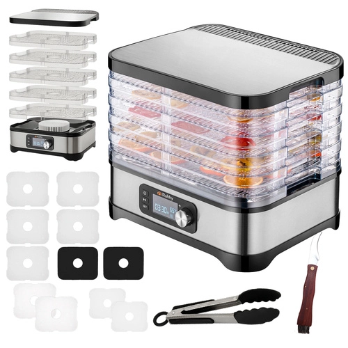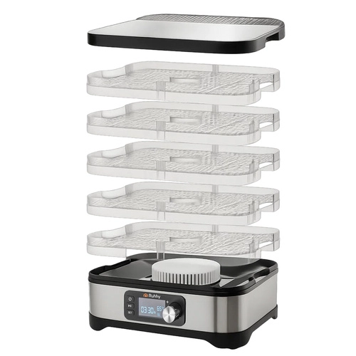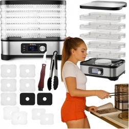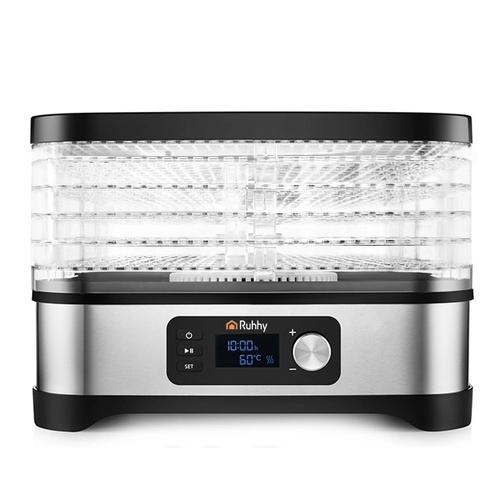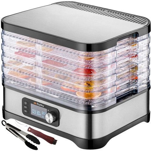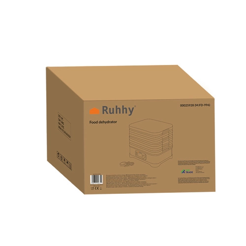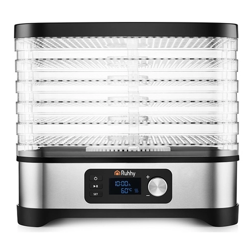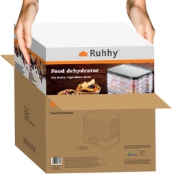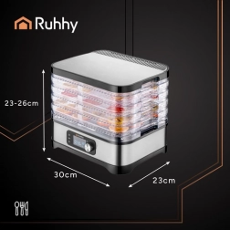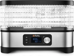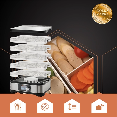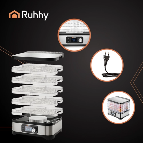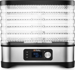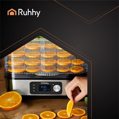 Suszarka RUHHY wyróżnia się uniwersalnym zastosowaniem - jest idealna do suszenia grzybów, owoców, warzyw i ziół. Wyposażona jest w 5 tac dla maksymalnej przestrzeni suszenia oraz regulowaną temperaturę od 35 do 70°C, dostosowaną do różnych rodzajów żywności.