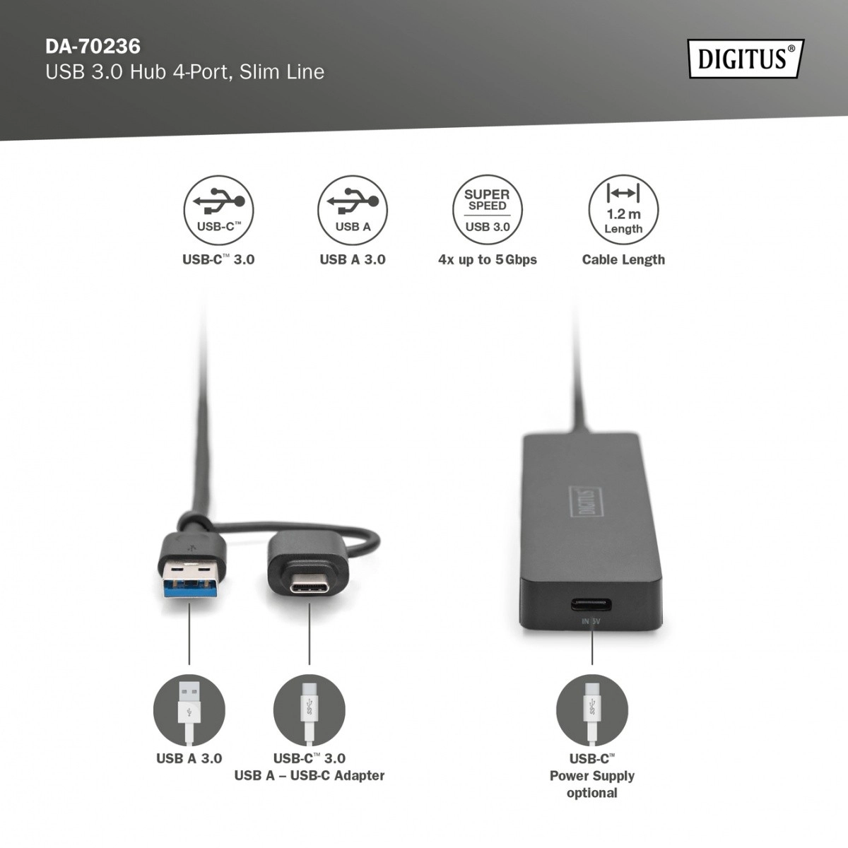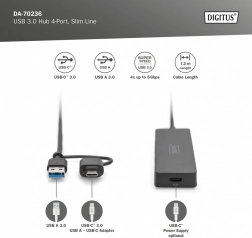 Hub USB 3.0 DIGITUS Slim Line to idealne rozwiązanie do rozszerzenia łączności w pracy lub w domu. Kompaktowa konstrukcja i kabel o długości 1,2 m pozwalają dostosować długość połączenia do notebooka lub stacji roboczej.
