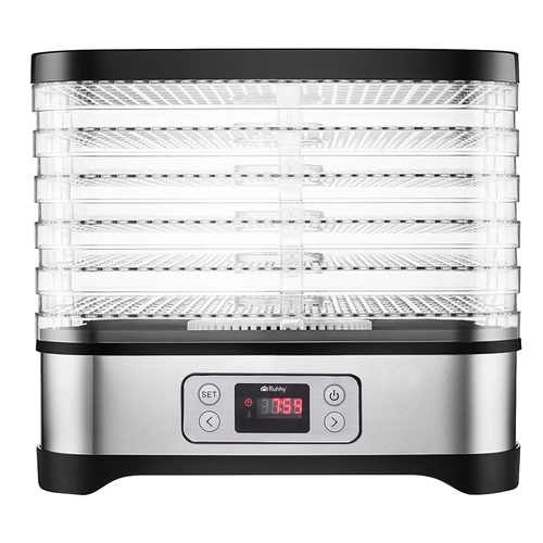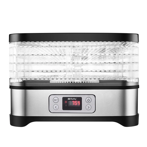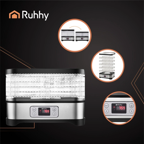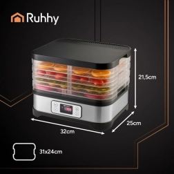 Uniwersalna suszarka Ruhhy o mocy 400 W umożliwia łatwe suszenie grzybów, owoców, warzyw i ziół. Jest wyposażona w 5 tac o łącznej pojemności 10 litrów, regulowaną temperaturę (35–70°C) oraz czytelny wyświetlacz z timerem do 24 godzin. Idealny wybór do domowego przechowywania przez cały rok.