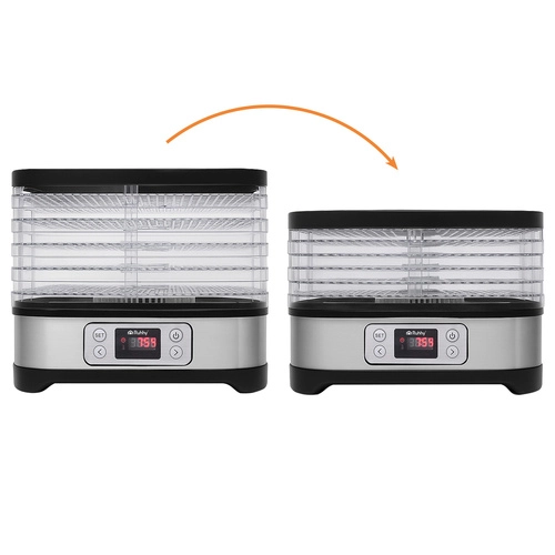 - Pojemność 10 litrów – 5 tac zapewnia wystarczającą przestrzeń do suszenia.