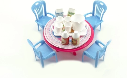 Ten zestaw mebli dla lalek wprowadzi do świata zabawy piękny stoliczek z krzesłami i drobnymi dodatkami. Dzięki kompaktowemu rozmiarowi 12 cm idealnie pasuje do mniejszych lalek i domków. Lekkie, plastikowe wykonanie jest trwałe i łatwe w utrzymaniu.
