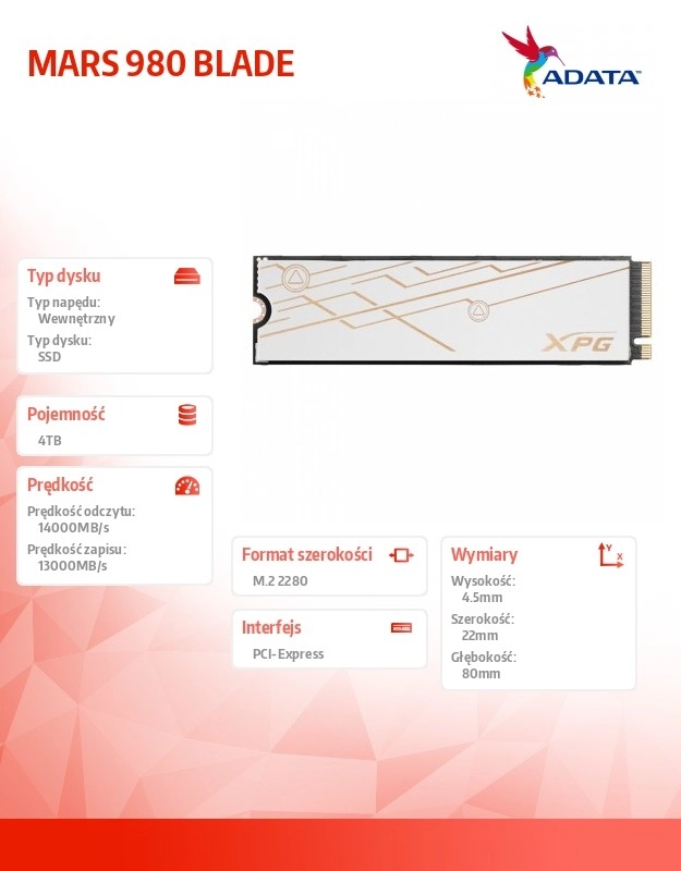 Dysk SSD XPG Mars Blade to pierwszy dysk SSD PCIe 5.0 przeznaczony do laptopów. Z błyskawiczną prędkością odczytu/zapisu do 14 000/13 000 MB/s i pojemnością do 4 TB zapewnia stabilną wydajność w najbardziej wymagających zadaniach.