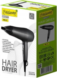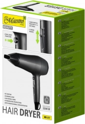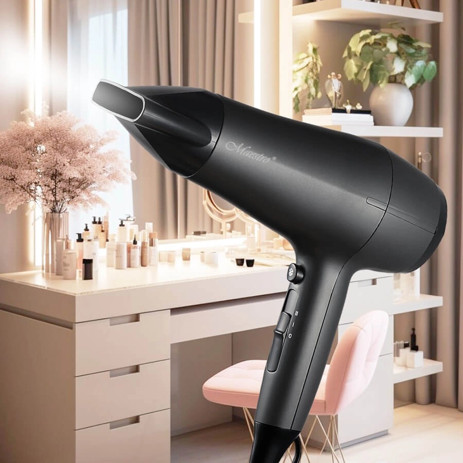 Suszarka do włosów Maestro posiada silnik DC, który gwarantuje długą żywotność i cichą pracę. W zestawie znajduje się koncentrator, umożliwiający precyzyjne ukierunkowanie strumienia powietrza, idealny do tworzenia różnych fryzur.