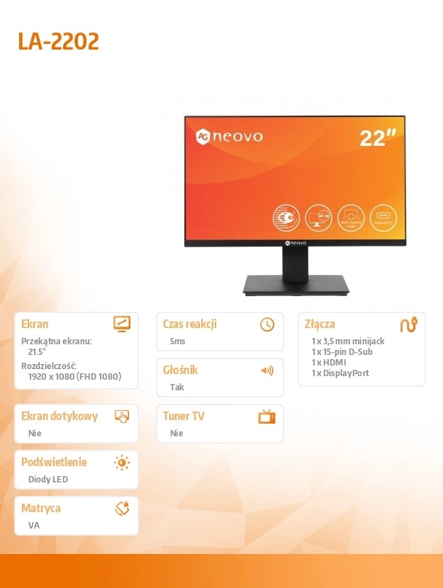 Monitor 22 cale idealny do biura i do domu z HDMI, DisplayPort i D-SUB do podłączenia.