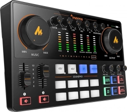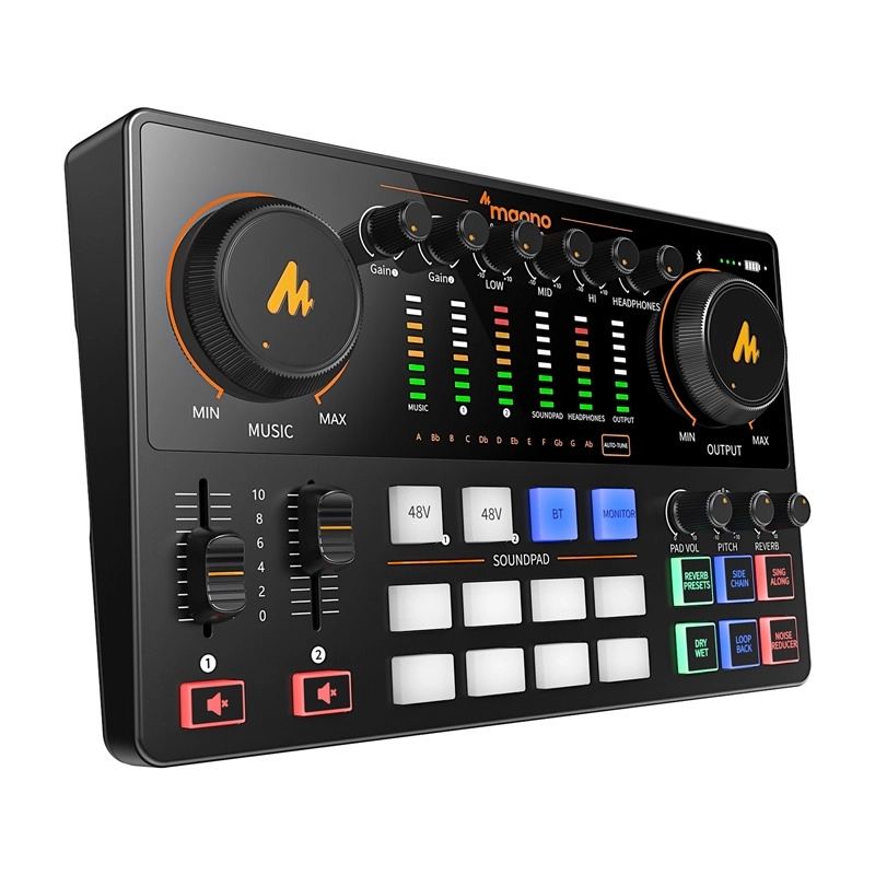 Maono E2 Gen2 zapewnia profesjonalne układy mikrofonowe z wzmocnieniem do 60 dB, co jest wystarczające dla większości mikrofonów dynamicznych i pojemnościowych. Każdy kanał ma własną kontrolę głośności i zasilania, zapewniając większą kontrolę podczas nagrywania różnych treści.